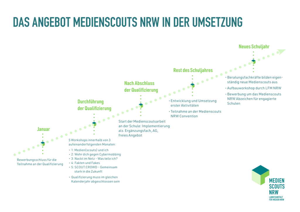Wesentlich für den Erfolg des Angebots ist es, dass Jugendliche als Medienscouts ihre Mitschülerinnen und Mitschüler bei der Mediennutzung beraten. Sie beantworten ihnen die Fragen, die sich ihnen unter anderen rund um die Themen Meinungsbildung im Netz, Cybermobbing und digitale sexualisierte Gewalt stellen. Mit Hilfe des Angebots lernen und vermitteln Schülerinnen und Schüler durch den Ansatz der „Peer-Education“ die Kompetenzen, die Voraussetzung sind für einen sicheren, fairen und selbstbestimmten Umgang mit digitalen Medien.